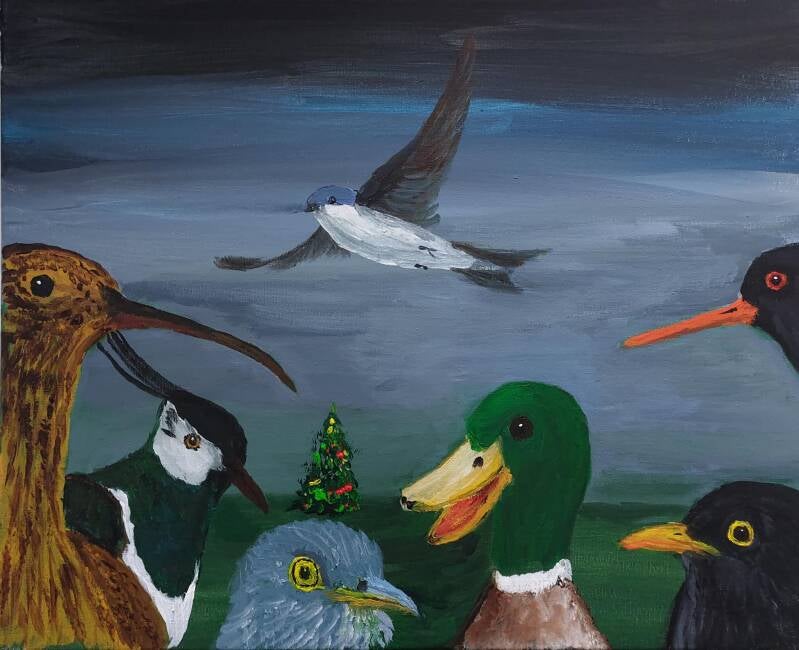 Uit de serie Vogels Nemen Selfies: de Ekster (acryl op papier), de Velduil (acryl op canvas) en de huismus (acryl op canvas)