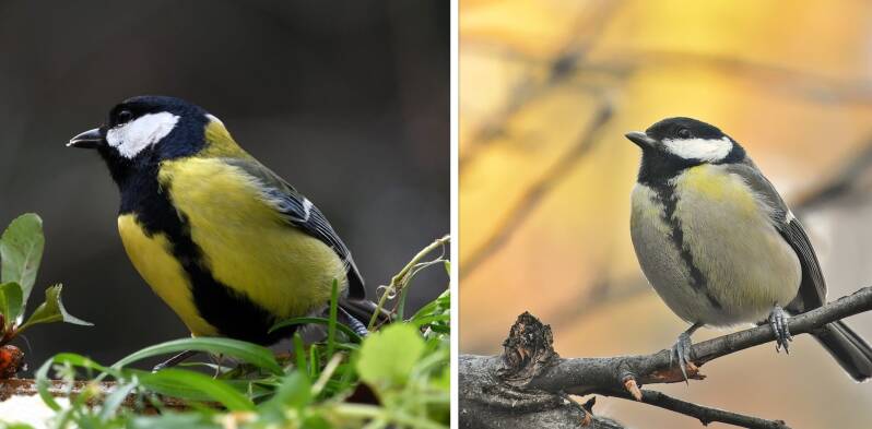Ook mevrouw koolmees (foto onder: rechts) heeft zwart op de borst, maar dat is meer een elegant sjaaltje. Haar ideale man heeft de grootste stropdas en het geelste overhemd. En als hij bij het zingen ook nog de laagste tonen weet te produceren, wordt ze helemaal week. Maar om verkeerslawaai te overstemmen zijn veel mannen juist hoger gaan zingen en nu voelen veel stoere mannen met een lage stem zich ongehoord….