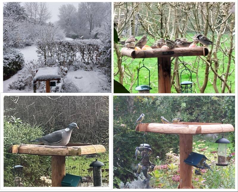 Pimpelmezen, steevast haantjes de voorste, pikken evenals koolmezen telkens één zonnepitje om dat een eindje verderop te kraken en ze zijn niet bang diep de pindakaaspot in te kruipen, waarin verder alleen af en toe een spreeuw of grote bonte specht zich waagt, halsbandparkieten komen ontspannen een pindaatje pellen, me intussen half-geïnteresseerd observerend, de altijd haastige meneer merel haalt snel een meelwormpje of pikt even in een appeltje, huismussen maken er een luidruchtig groepsuitje van, soms met tientallen tegelijk, pimpel- kool- en staartmezen hangen graag in trosjes aan de vetbollen, de heggenmus scharrelt onopvallend wat restjes bij elkaar op de grond, vinken ook, maar op veiliger afstand.